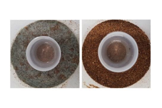 Mould development on day 13 after treatment with commercial inclusion rates (left: formaldehyde 3kg/t, right: Fylax Forte-HC liquid 5kg/t).